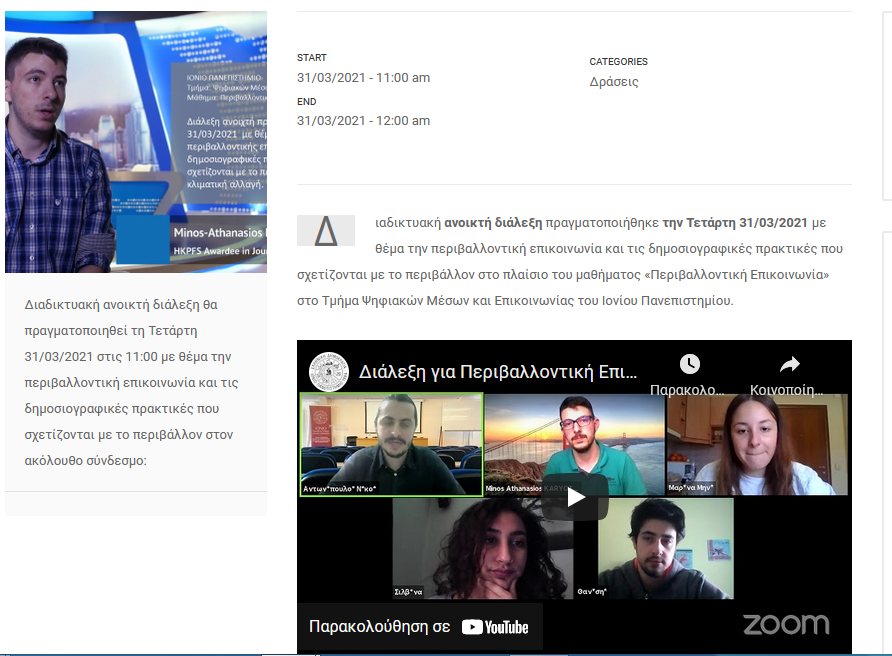 I gave two lectures in Greek, “Theories of Environmental Communication” and “Journalistic Practices and the Environment” at the Department of Digital Media and Communication at Ionian University in March.